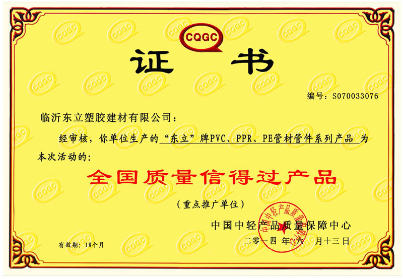 全國質量信得過產品證書